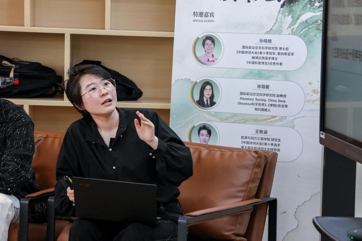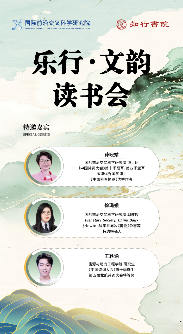 在第31个世界读书日来临之际,国际前沿交叉科学研究院(以下称“国交院”)联合知行书院举办“乐行·文韵”主题读书会。作为北航第六届诗词大会的重要活动之一,本次读书会邀请到国交院空间科学科教合作中心博士后、《中国诗词大会》第十季冠军孙晓婧,国交院空间科学科教合作中心教师徐璐媛,以及《中国诗词大会》第十季选手、第五届北航诗词大会特等奖得主、能源与动力工程学院研究生王轶涵共同交流。近40名师生齐聚一堂,共同开启一场跨越古今、融通文理的阅读之旅。